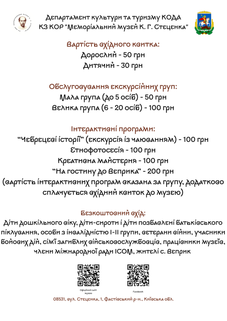 З 01.06.2025 р. вартість платних послуг у КЗ КОР “Меморіальний музей К. Г. Стеценка” змінюється